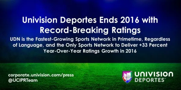 Univision Deportes (UDN) delivered record ratings and double-digit growth in key metrics for its sports content across media platforms in 2016. Additionally, UDN, which launched in 2012 and will celebrate its fifth anniversary in 2017, registered year-over-year ratings gains for the fourth consecutive year and was the only sports network to do so, broadcasting some of the most-watched sporting events in the U.S. UDN saw a year-over-year increase of +33 percent – making it the fastest-growing of any TV network, regardless of genre or language, in primetime – and averaged 124,000 Adults 18-49 in 2016.