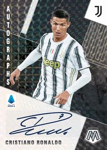In what is a unique situation, you can actually chase Ronaldo autographs in all three leagues of 2020-21 cards. With Panini’s launch of Mosaic for both Serie A and La Liga, he is featured with autograph cards in both sets (though you will only find his base card in the Serie A set). In Panini’s Prizm Premier League set, he is also featured in the Flashback Autographs checklist in his Manchester United gear. Recent sales for both the Mosaic (Real Madrid) and Prizm (Manchester United) cards were north of $1,500.