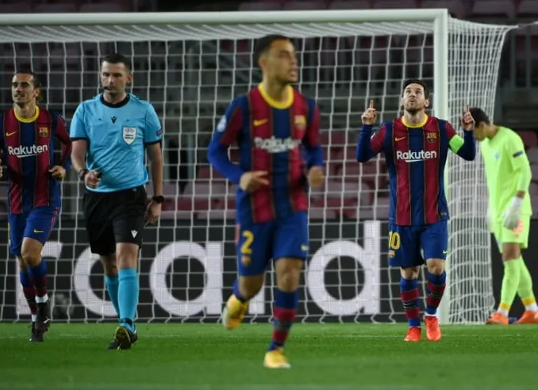 Making his 150th appearance in European competition, Messi dispatched an early penalty at Camp Nou after he was fouled in the area and Gerard Pique headed in Ansu Fati’s cross on the hour.