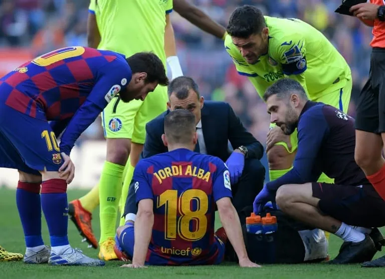 Madrid (AFP) – Barcelona left-back Jordi Alba hobbled off in the 20th minute of the Spanish champions’ La Liga game against Getafe on Saturday with an apparent right thigh injury.