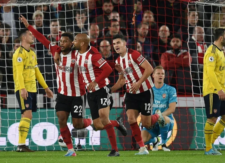 With the Bramall Lane crowd in full voice, a bruising clash got off to a contentious start when Arsenal defender Sokratis appealed in vain for a penalty after having his shirt tugged by John Egan.