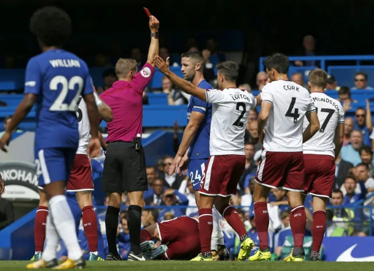 After being reduced to 10 men in both the FA Cup final and the Community Shield, Conte’s men finished the opening game of their Premier League title defence with just nine players after Gary Cahill and Cesc Fabregas were both dismissed in a pulsating 3-2 defeat by Burnley at Stamford Bridge on Saturday.