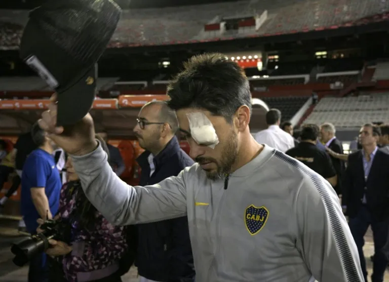 Images circulating on Argentine television showed players stepping off their team bus rubbing their eyes from the effects of the pepper spray, while others from inside their dressing room showed them being treated for cuts by doctors.