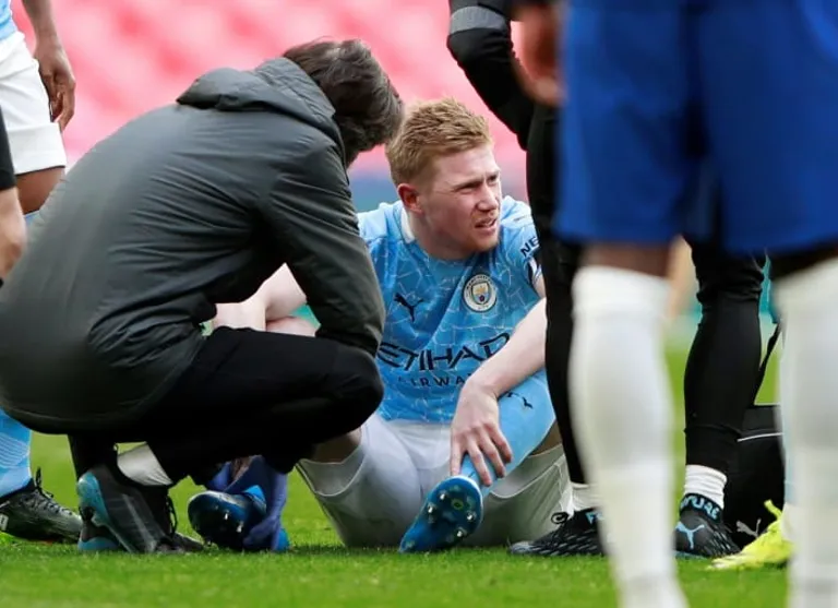 The Belgium playmaker came off worst in a challenge with N’Golo Kante just two minutes into the second-half and hobbled off to be replaced by Phil Foden.