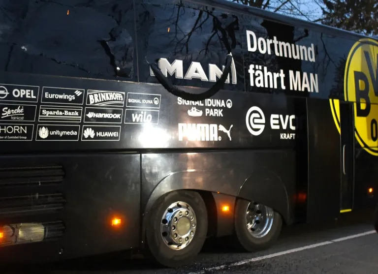 Three explosive devices hidden in a hedge went off next to the team bus, just as it left the squad’s hotel heading for a Champions League quarter-final match at home against Monaco.
