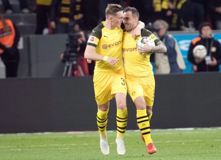 Berlin (AFP) – New signing Paco Alcacer came off the bench to score two late goals and seal Borussia Dortmund’s stunning 4-2 win as they fought back from two goals down at Bayer Leverkusen on Saturday to knock Bayern Munich from top spot in the Bundesliga.