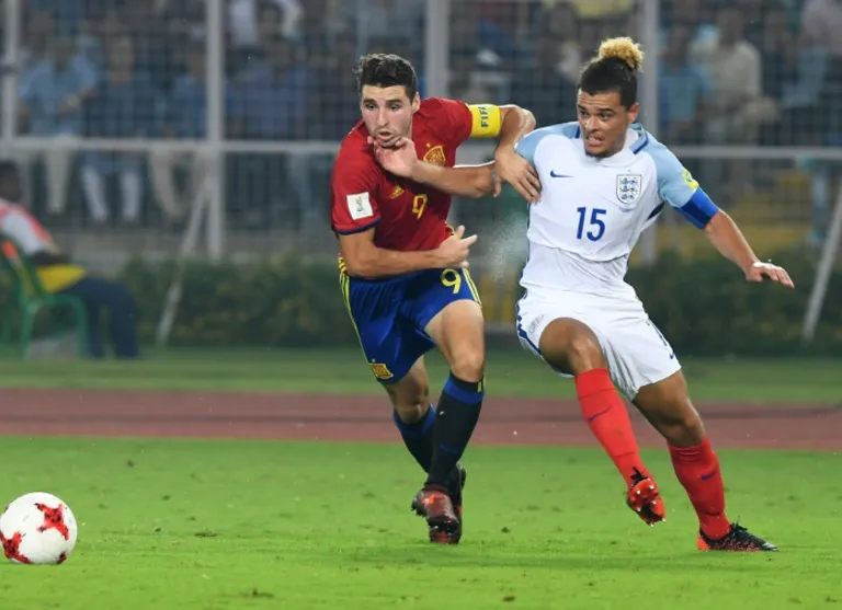 Gibbs White’s low shot in the first minute of a fierce-paced final in front of 66,600 fans produced a lightning reflex save from Alvaro Fernandez in the Spanish goal. But Spain captain Abel Ruiz masterminded the first goal in the 10th minute, heading the ball down in the goal area for Barcelona teammate Sergio Gomez to push the ball in the net.