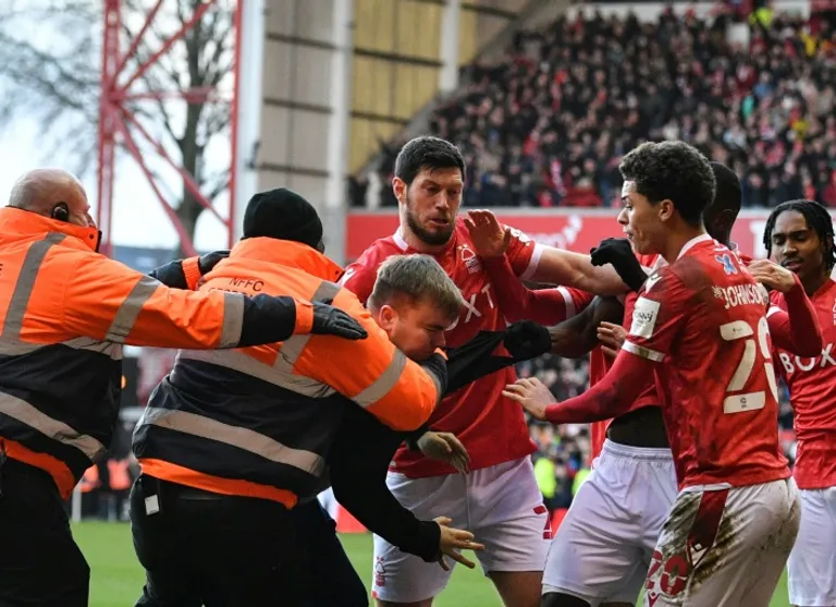 Footage posted on social media showed a supporter throwing punches at Forest players as they celebrated their third goal in the 32nd minute of the game at the City Ground, before he was hauled down by two stewards.