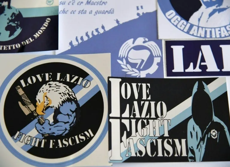 The emblematic eagle of the Stadio Olimpico side, also the symbol of the fascist party of Benito Mussolini, under the slogan “Love Lazio, Fight Fascism” is one of the stickers printed by LAF.