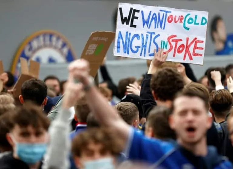 Fans held up signs reading: “RIP Football 1863 – 2021”, “Created by the poor, stolen by the rich”, “We want our cold nights in Stoke” and “Roman do the right thing” — in reference to Chelsea owner Roman Abramovich.