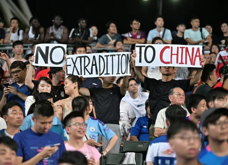 One banner unfurled among the 20,926-strong Hong Kong Stadium crowd said: “No China extradition, HK = police state, please save HK!!”