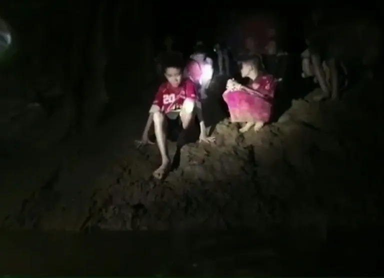 The emaciated and dishevelled “Wild Boars” were found after nine days of no contact on a small, muddy bank surrounded by water several kilometres inside the Tham Luang cave in northern Thailand.