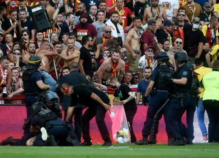 Riot police intervened when dozens of Lens supporters stormed the pitch at half-time to confront Lille fans, while both sets of supporters hurled seats at each other over a partition wall.