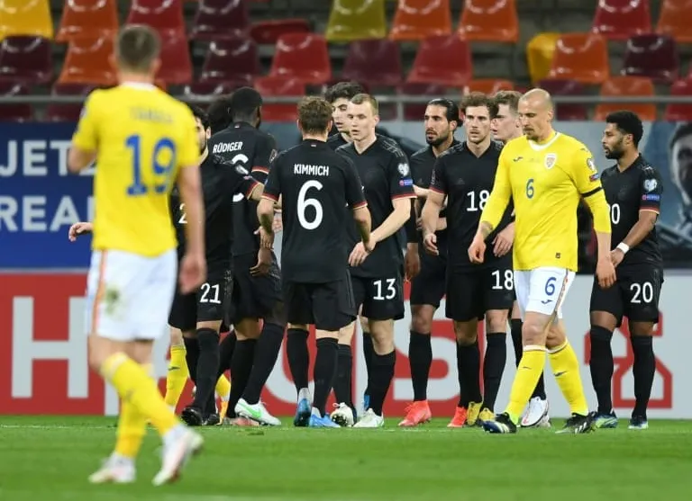 Before their 1-0 win over Romania in Bucharest on Sunday, the German team briefly reversed their shirts prior to kick-off with the numbers facing forwards.