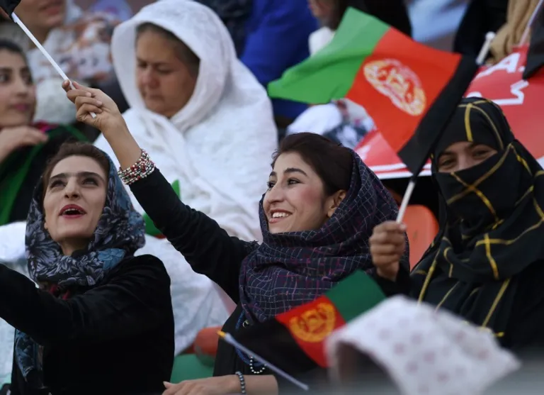 A cross section of women — students, professionals and grandmothers — hold red “Goaaal!” posters and wave Afghan national flags as they scream the names of their favourite team, their faces beaming.