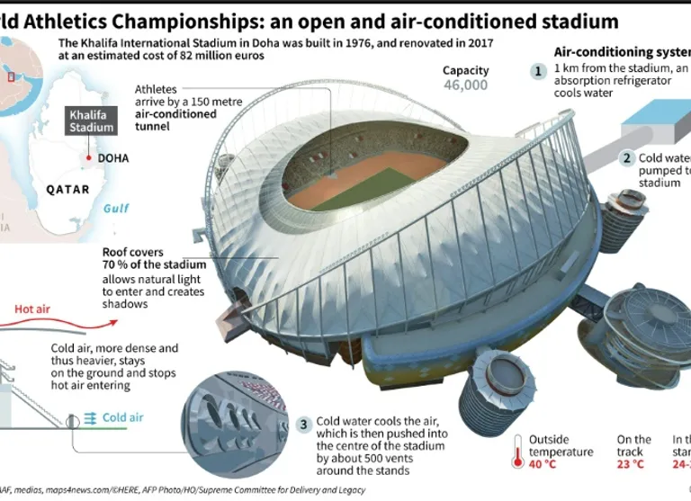 Doha’s Khalifa stadium, the venue for the World Championships, will be maintained at a pleasant 23-25 degrees Celsius while the outside daytime air temperature exceeds 40 degrees and humidity hovers above 50 percent.