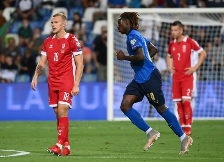 Paris (AFP) – Moise Kean grabbed his first international goals since March 2019 as Italy thrashed Lithuania 5-0 in World Cup qualifying on Wednesday, as Damian Szymanski’s late header forced England to settle for a draw in Poland.