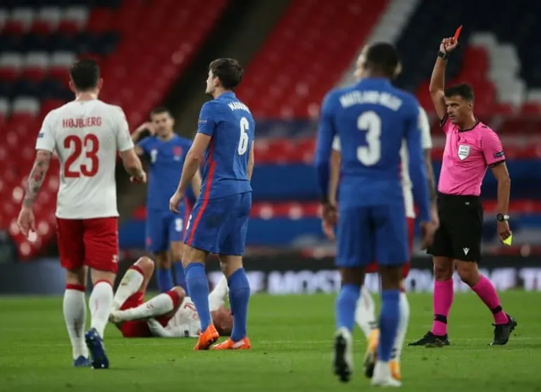 Harry Maguire was sent off for England in the first half at Wembley for two clumsy yellow cards, and Christian Eriksen then converted a 35th-minute penalty on the occasion of his 100th cap to put the Danes ahead.