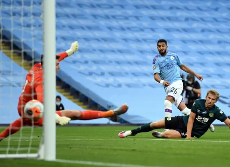 VAR awarded Mahrez the chance to double his tally from the penalty spot after Mee caught Sergio Aguero.