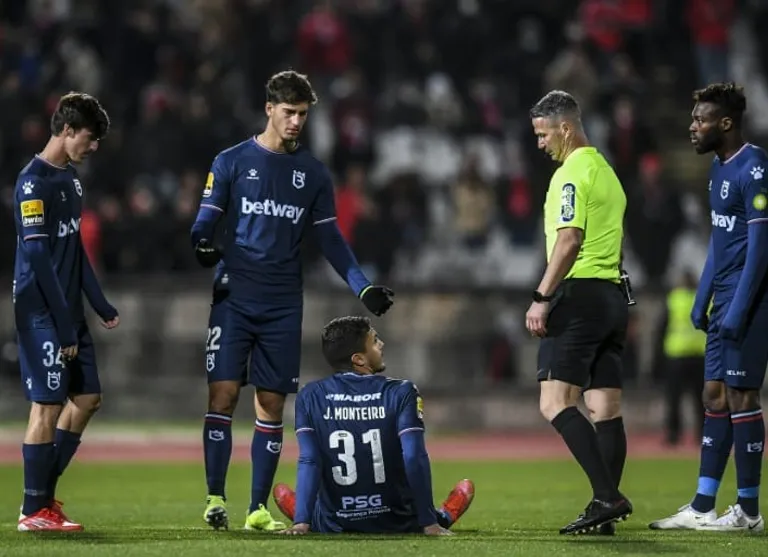 The Primeira Liga game was called off by referee Manuel Mota three minutes into the second half, after Belenenses were reduced to six players. They had emerged after half-time with only seven players before Monteiro went down injured.