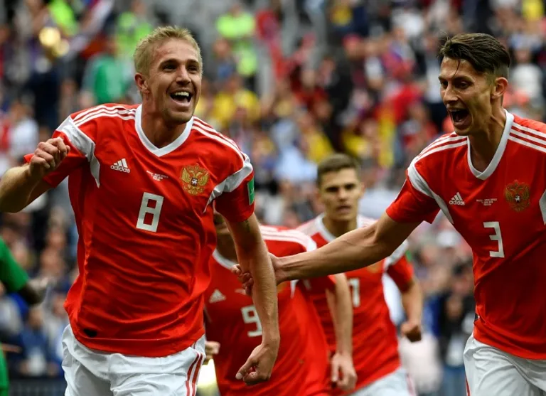 Then, to the delight of the home fans, Iury Gazinsky headed Russia in front in the 12th minute after a cross from Aleksandr Golovin. Substitute Denis Cheryshev rifled home a second shortly before half-time.