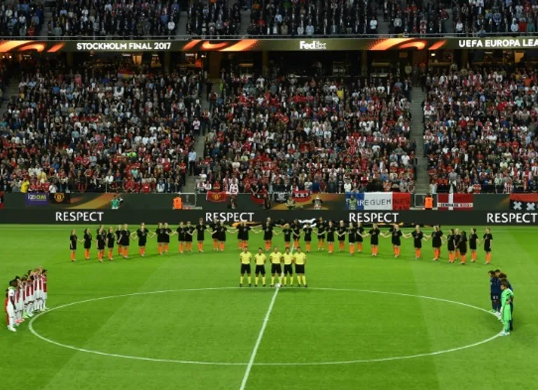 The two teams stood around the centre circle at Stockholm’s Friends Arena with their heads bowed during a brief period of silence, United’s players sporting black armbands, before fans of both sides burst into applause.