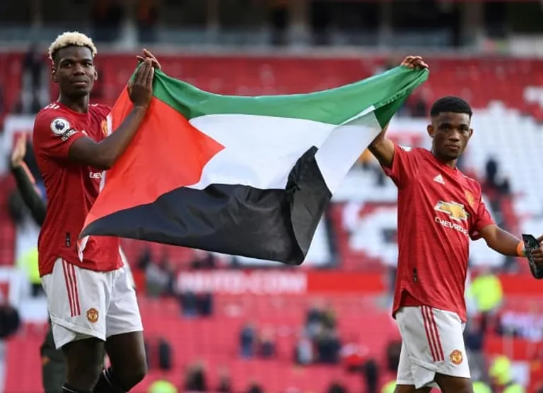 French World Cup winner Pogba and Ivorian winger Diallo, who are both Muslim, displayed the flag in support of Palestine, with around 10,000 fans at Old Trafford watching on after coronavirus restrictions were lifted.