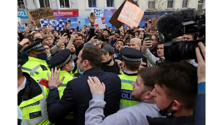 Former Chelsea goalkeeper Petr Cech, now the club’s technical advisor, had come out of the stadium in a bid to persuade fans to clear the roads as the home side’s team bus was held up by the protest, causing kick-off to be delayed by 15 minutes.
