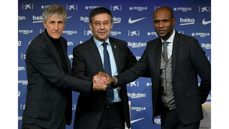 Sitting alongside Setien was club president Josep Maria Bartomeu and sporting director Eric Abidal.