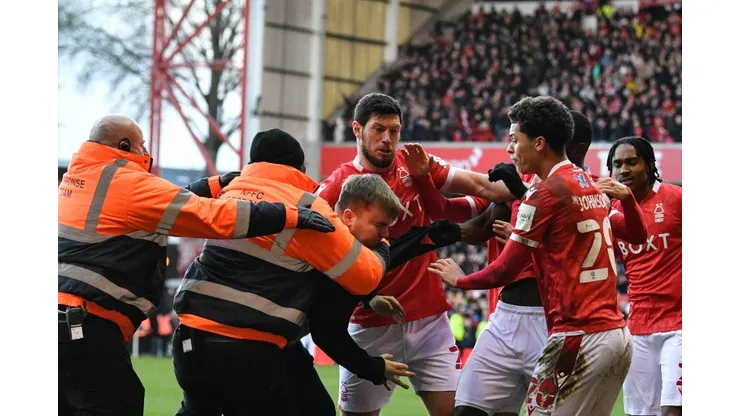 Footage posted on social media showed a supporter throwing punches at Forest players as they celebrated their third goal in the 32nd minute of the game at the City Ground, before he was hauled down by two stewards.