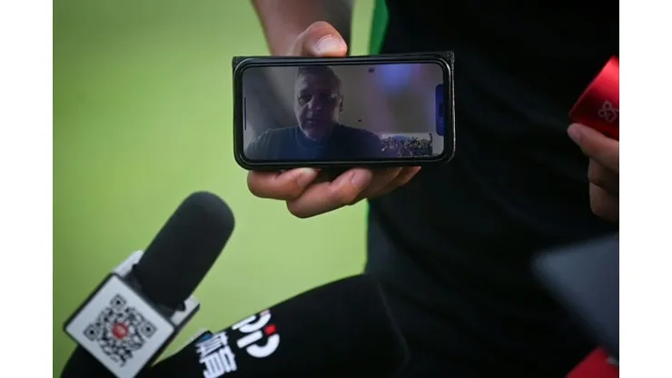 A mobile phone was held by a Guoan staff member who translated Genesio’s comments from French to Chinese for the media.