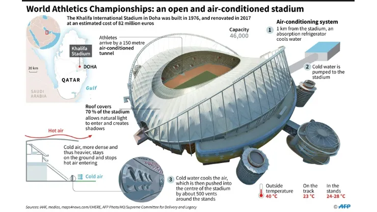 Doha’s Khalifa stadium, the venue for the World Championships, will be maintained at a pleasant 23-25 degrees Celsius while the outside daytime air temperature exceeds 40 degrees and humidity hovers above 50 percent.