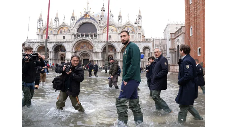 Goalkeeper Gianluigi Donnarumma donned knee-high wellington boots along with Italian football federation (FIGC) president Gabriele Gravina to visit the inundated St Mark’s Square.