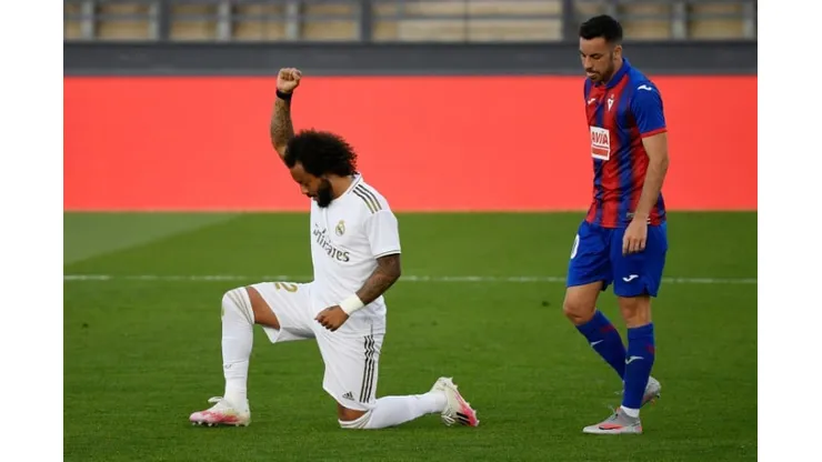 After scoring Madrid’s third goal in the 37th minute, Marcelo dropped onto his left knee and raised his clinched right fist into the air, apparently in support of the Black Lives Matter movement.