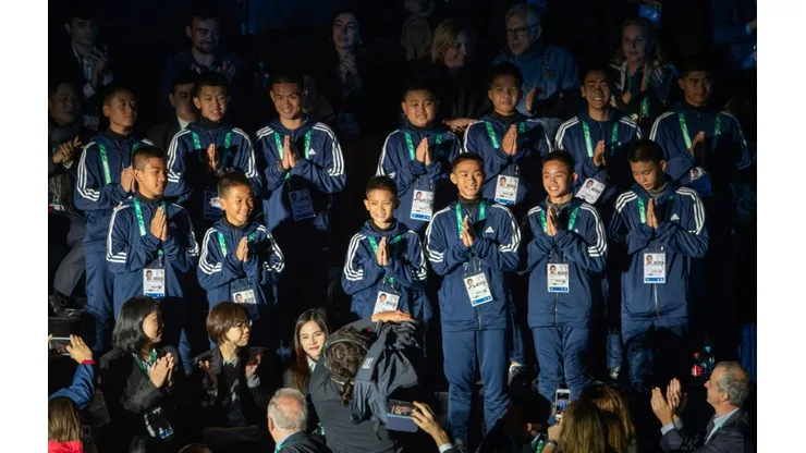 The Thai youngsters, accompanied by the coach who took them on their trip to the Thuam Luang cave complex on June 23, were given a guard of honour by their Argentinian counterparts as they took to the pitch.