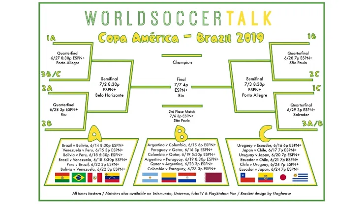 World Soccer Talk has created a bracket for the 2019 Copa America that is a free, printable download.