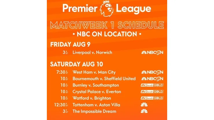 NBC Sports’ coverage of the 2019-20 Premier League season kicks off this Friday, August 9, when Liverpool host Norwich City at 3 p.m. ET on NBCSN and Universo. Coverage continues throughout the weekend, highlighted by Manchester United v. Chelsea, featuring the expected debut of U.S. Men’s National Team midfielder Christian Pulisic with Chelsea, this Sunday, August 11 at 11:30 a.m. ET on NBCSN and Telemundo.