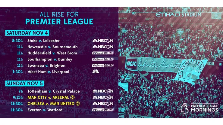 Live Premier League match coverage begins this Saturday, November 4, at 7:30 a.m. ET with Premier League Live on NBCSN followed by Stoke City v. Leicester City at 8:30 a.m. ET, and Newcastle v. Bournemouth at 11 a.m. ET.