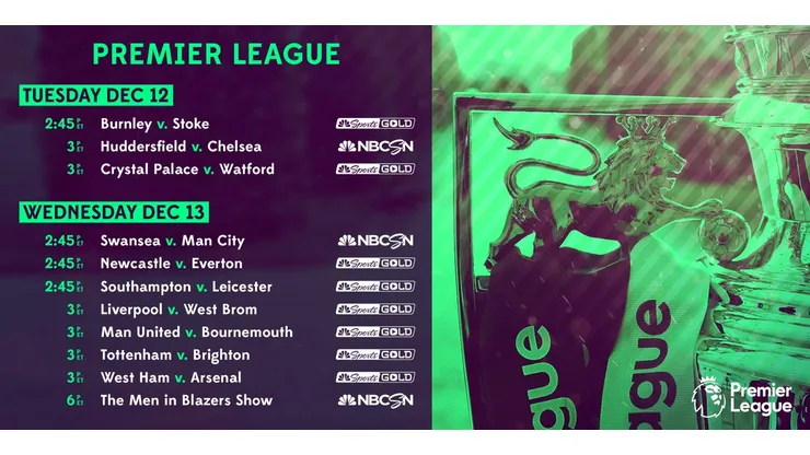Mid-week match coverage begins Tuesday, December 12, at 2 p.m. ET with Premier League Live, followed by Huddersfield Town v. Chelsea at 3 p.m. ET on NBCSN. Coverage on Wednesday, December 13, begins at 2 p.m. ET with Premier League Live on NBCSN followed by Swansea versus Manchester City at 2:45 p.m. ET on NBCSN.