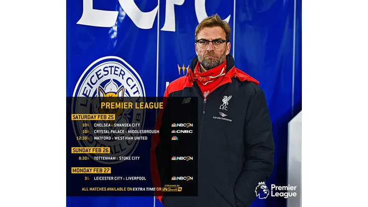 Premier League Sunday this Sunday, Feb. 26, begins at 7:30 a.m. ET with Premier League Live on NBCSN, followed by third-place Tottenham v. Stoke City at 8:30 a.m. ET on NBCSN and TELEMUNDO. Tied on points with fourth-place Arsenal, Spurs are looking to rebound following a 2-0 loss to Liverpool.