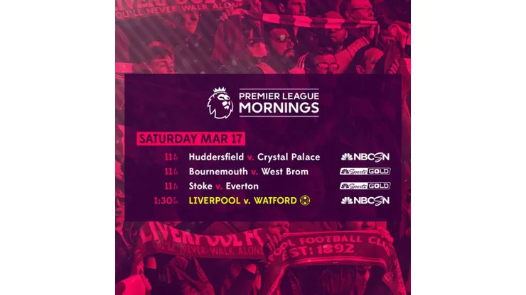 Fourth-place Liverpool host Watford this Saturday, March 17, at 1:30 p.m. ET on NBCSN and Universo, highlighting NBC Sports Group’s live Premier League coverage this weekend. The Reds look to maintain their top-four position and bounce back from a 2-1 loss to Manchester United, which snapped their three-match Premier League winning streak. NBC Sports Group’s lead Premier League play-by-play announcer Arlo White calls the match, joined by analyst Lee Dixon at Anfield.