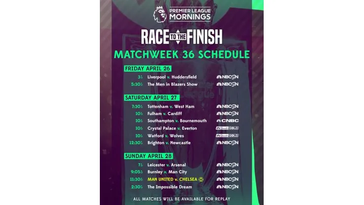NBC Sports’ Premier League coverage concludes on Sunday, April 28 at 11:30 a.m. ET with sixth-place Manchester United v. fourth-place Chelsea on NBCSN and Telemundo. Separated by only three points, the two teams face a critical battle in determining the top-4 picture.