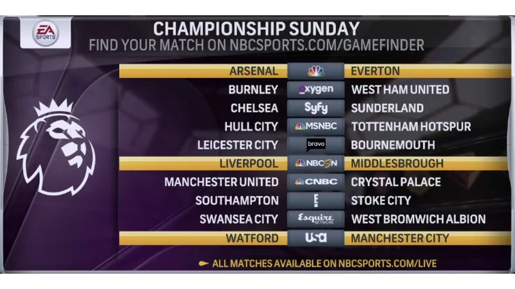 Premier League “Championship Sunday” matches on May 21 will be televised live on the following networks of NBCUniversal, all at 10 a.m. ET: