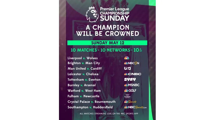 With one of the most exciting title races in history concluding this weekend, NBCUniversal presents a historic Championship Sunday, with all 10 matches presented live simultaneously across NBCUniversal platforms this Sunday, May 12 at 10 a.m. ET. For the first time since 2013-14, the winner of the Premier League will be decided on Championship Sunday.