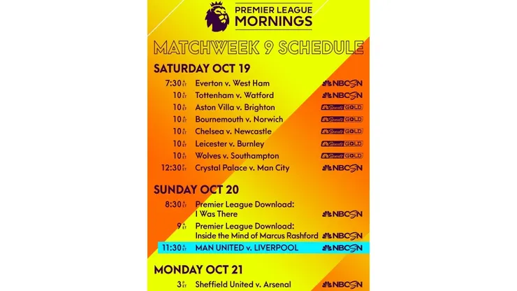 NBC Sports’ coverage of the Premier League returns this weekend as first-place Liverpool visit Manchester United on Sunday, Oct. 20 at 11:30 a.m. ET on NBCSN and Telemundo. Sadio Mane and the Reds look to equal the all-time top-flight winning streak record, while Manchester United aim to collect their first win since mid-September at Old Trafford. Arlo White calls the match, joined by Graeme Le Saux and Lee Dixon.