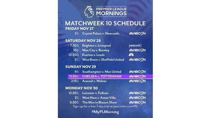 Sunday begins with Premier League Mornings at 8 a.m. ET on NBCSN, followed by fifth-place Southampton v. Manchester United at 9 a.m. ET on NBCSN and Telemundo. Following Chelsea-Tottenham, Arsenal host Wolverhampton Wanderers at 2:15 p.m. ET (NBCSN, Universo).