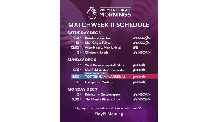 Sunday begins with Premier League Mornings at 6:50 a.m. ET on Peacock Premium, followed by West Brom v. Crystal Palace at 7 a.m. ET. Continuing on Peacock Premium, Sheffield United host Jamie Vardy and fourth-place Leicester City at 9:15 a.m. ET. Following Tottenham-Arsenal at 11:30 a.m. ET on Peacock Premium, second-place Liverpool visit seventh-place Wolverhampton Wanderers at 2:15 p.m. ET.