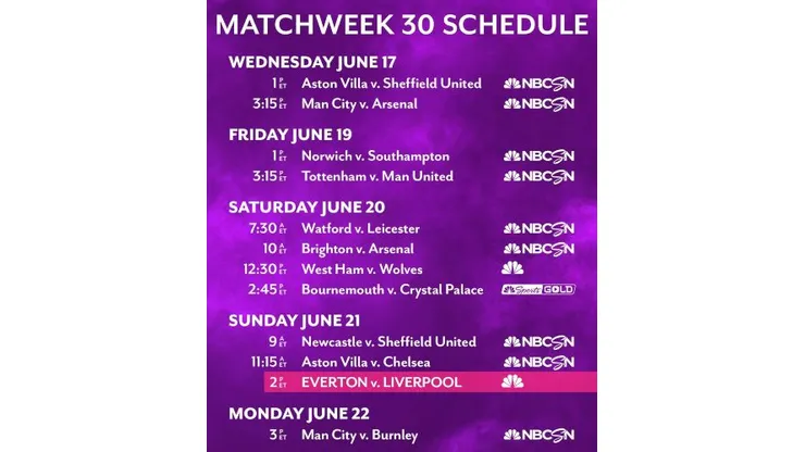 On Friday, June 19, the first full weekend of coverage begins with Premier League Live at Noon ET on NBCSN, followed by Norwich City v. Southampton at 1 p.m. ET. Then at 3:15 p.m. ET, eighth-place Tottenham host fifth-place Manchester United, who trail fourth-place Chelsea by three points.