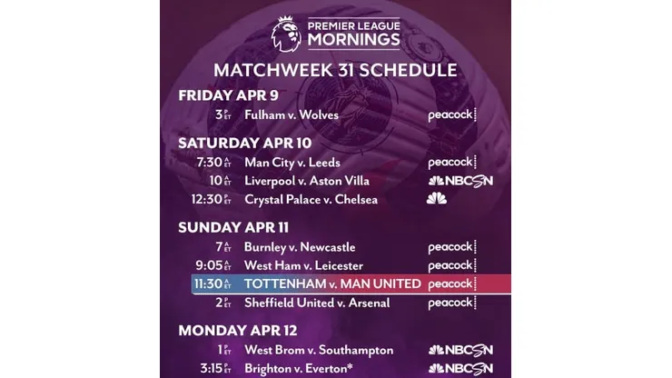 On Sunday, match coverage begins at 7 a.m. ET with Burnley-Newcastle on Peacock, followed by West Ham v. third-place Leicester City at 9:05 a.m. ET on Peacock. Following Tottenham-Manchester United at 11:30 a.m. ET on Peacock, Arsenal visit Sheffield United at 2 p.m. ET (Peacock).