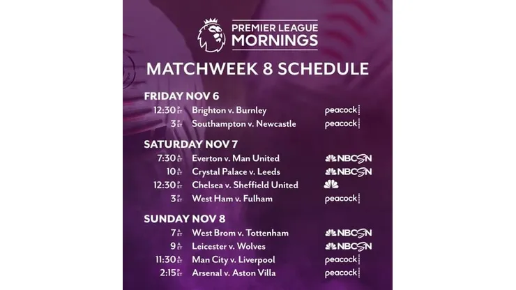 This weekend’s coverage kicks off Friday, Nov. 6 at Noon ET with Premier League Live on Peacock Premium, followed Brighton & Hove Albion v. Burnley at 12:30 p.m. ET (Peacock Premium). Then at 3 p.m. ET, fifth-place Southampton, who are unbeaten in their last five matches, host Newcastle on Peacock Premium.